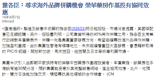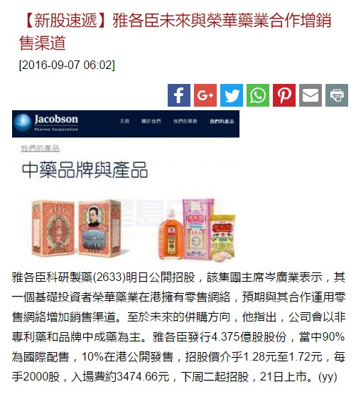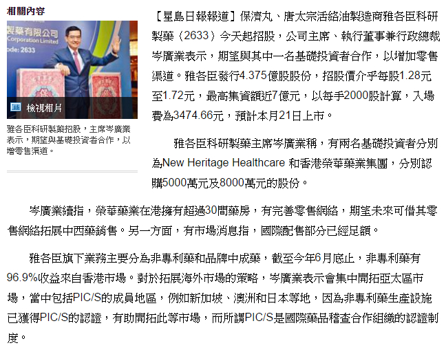 香港榮華藥業集團成為雅各臣科研製藥 (02633) 上市的基礎投資者,預期未來可以產生協同效應,有更多空間合作。