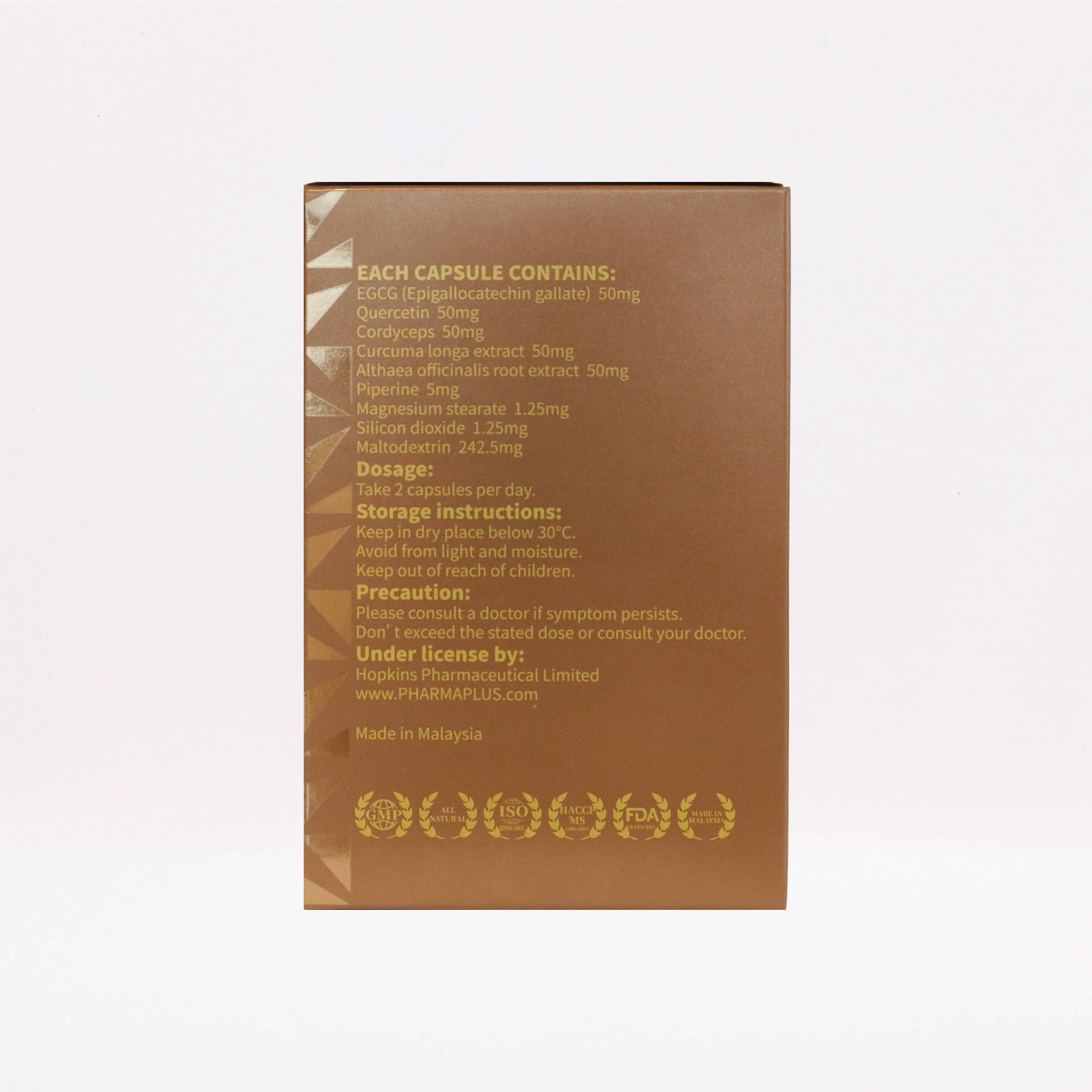 " EGCG(表沒食子酸沒食子酸酯),槲皮素 ,冬蟲夏草,薑黃萃取,錦葵根萃取 ,胡椒鹼,鎂硬脂酸鹽,二氧化矽,麥芽糊精 "